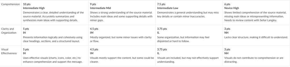 I’ve used infographics in Spanish 1 and Spanish 4, with tasks ranging from visualizing a class story to creating a film critique infographic.